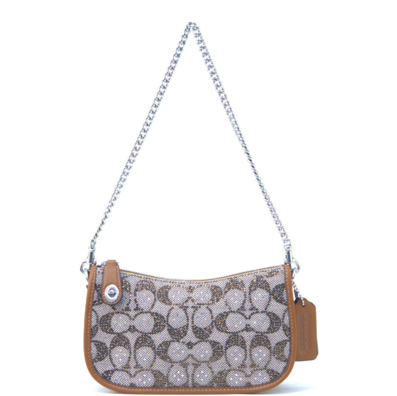 The Coach Swinger 20 Crystal Signature Jacquard Shoulder Handbag in Burnished Amber is the ideal accessory for those seeking a blend of luxury, style, and convenience. Its sleek design and thoughtful features make it a must-have for any fashion-forward individual